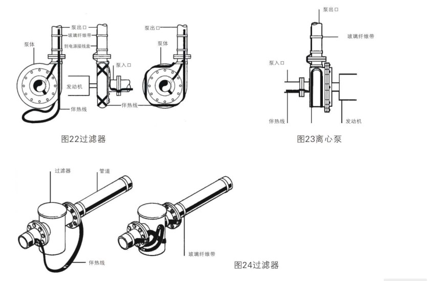 以上復雜管線電伴熱安裝前夕,需根據現場不同管徑,長度,計算熱損耗。確定電伴熱安裝比例與電伴熱帶米數(其中泵,過濾器,儀表等其他管道附件,需預留數量)。根據管道的配備相應的電源接線盒,鋁箔膠帶,熱敏膠帶與不銹鋼帶等。其閥門,泵,過濾器,儀表電伴熱帶安裝圖列參照下圖。