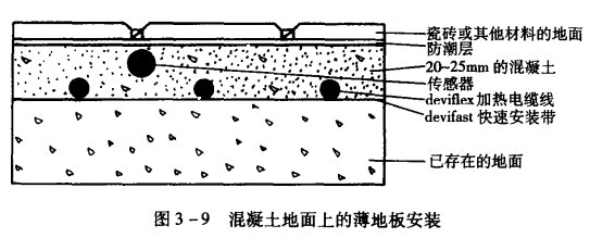 該系統(tǒng)是由可加熱柔韌電纜和感應器、恒溫器等構成,可劃分為兩類:一種是加熱電纜線,可廣泛應用于各種安裝區(qū)域;另一種是加熱席墊,用于薄地板、翻新后的地板。該供熱方式適用于任何材質的地面(見圖3一9、圖3一10),如木地板、大理石、瓷磚等。