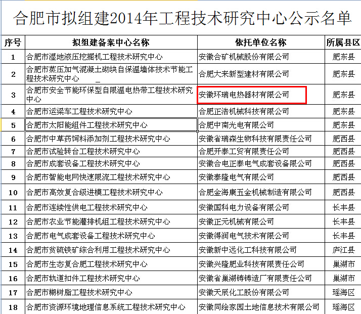 根據(jù)《合肥市工程技術研究中心管理辦法》要求,擬組建2014年合肥市工程技術研究中心,安徽環(huán)瑞電熱器材有限公司成功進入合肥市工程研究中心名單: