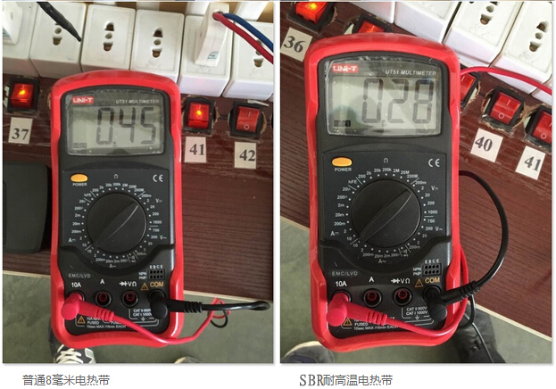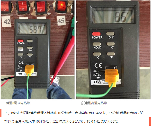 SBR型耐高溫電伴熱在模擬沸水管道狀態下使用后,啟動電流基本無變化,產品性能更加穩定,有效地降低了伴熱帶起火燃燒的概率,提高了使用壽命,發熱溫度更高,更適合太陽能管道伴熱。